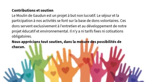 Le séjour au Moulin de Gaudun s'inscrit dans le cadre de notre lieu d'éducation et de rencontre à but non lucratif.